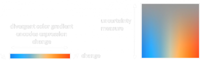 Changes in expression levels for genes or proteins are visualized using a color gradient. Multivariate data (expression change combined with uncertainty and amount of biomolecules) may be represented using gray shading (i.e. saturation - see figure) or variation of brightness.